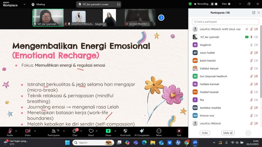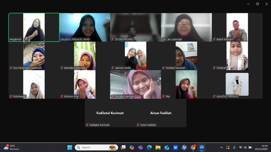 Sabtu, 1 November 2025, Program Studi Pendidikan Islam Anak Usia Dini (PIAUD) Universitas Al-Amien Prenduan menggelar webinar bertajuk “Menjaga Semangat Mengajar: Strategi Pencegahan Burnout untuk Guru PAUD”. Kegiatan ini dilaksanakan secara daring melalui Zoom Meeting dan diikuti oleh seluruh dosen, dan mahasiswa seluruh angkatan prodi PIAUD.