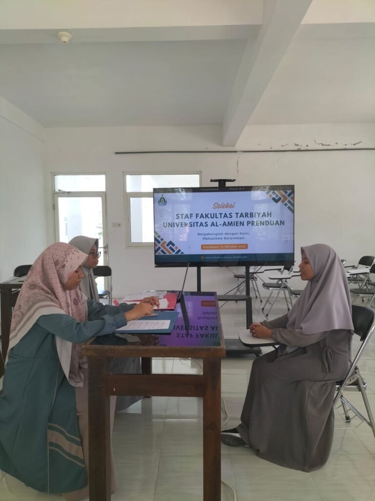 Proses wawancara dipimpin langsung oleh Wakil Dekan I dan II Fakultas Tarbiyah, yakni Muru’atul Afifah, M.Pd.I dan Luthfatul Qibtiyah, M.Pd.I, yang bertindak sebagai tim penyeleksi utama. Keduanya menilai para peserta berdasarkan etika, kepribadian, kemampuan komunikasi, kerja sama tim, tanggung jawab, serta keterampilan teknis administrasi dan desain digital.